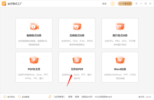 1、打开金舟格式工厂,点击【文件转PDF】。