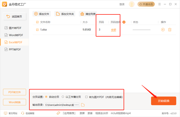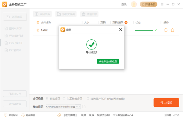 根据小编的亲自试用,推荐大家使用金舟格式工厂,它是一款功能全面且转换速度较快的格式转换工具,而且转换后排版与源文件一致,减少排版烦恼。而且上手非常简单,新手小白也可一键将Excel转换为PDF。同时还支持视频、音频、图片等格式转换。
