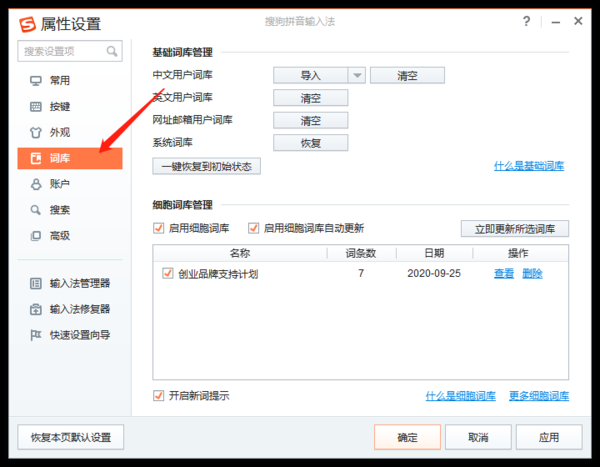 然后在“属性设置”的页面找到左侧的“词库”,点击一下就进入到了词库管理的设置页面。