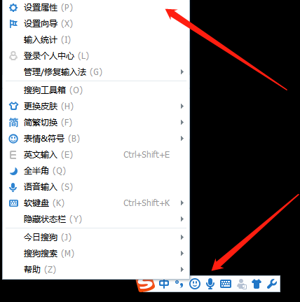那么该如何利用好搜狗输入法里的词库呢,电脑上找到搜狗输入法的状态栏,鼠标右键点击一下,在弹出的菜单中选择第一个“设置属性”功能。