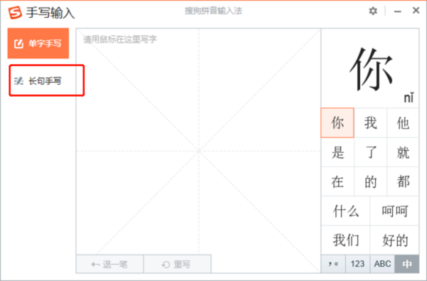 4、而且手写输入功能还支持长句输入,点击左侧的“长句手写”,这样就可以连续的写一段话了。