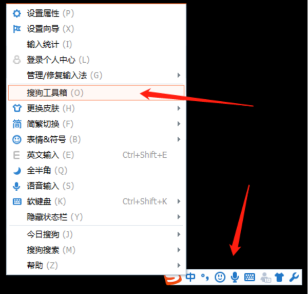 1、在电脑上安装搜狗输入法以后,通过键盘ctrl加shift的组合,切换到搜狗输入法的状态栏,然后鼠标右键输入法的状态栏,就会弹出一个菜单,在菜单栏中找到“搜狗工具箱”。