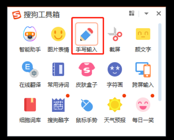 2、如下图所示,在搜狗工具箱里有非常多的功能,点击第一行的第三个“手写输入”,这样就进入到了手写输入的面板了。
