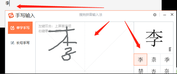 3、在电脑版的搜狗输入法手写输入窗口可以通过滑动鼠标来写笔画,就算写的不太标准,搜狗输入法也是可以识别出来的,所以不用担心父母用不惯这个功能。