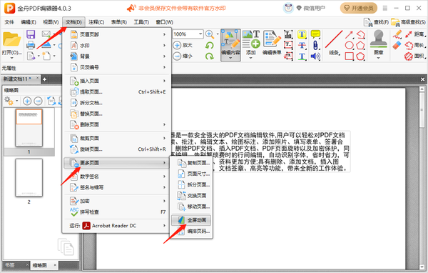 1、使用金舟PDF编辑器打开文件后,点击上方菜单栏的【文档】-【更多页面】-【全屏动画】。