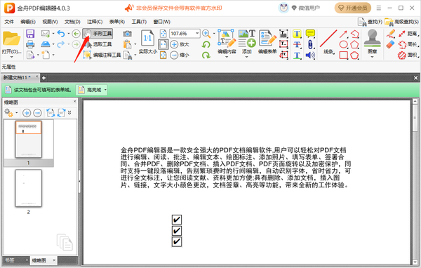 pdf格式文件可以保证传输过程中文件内容不被破坏,因此我们在工作中经常需要对pdf文件进行编辑,当我们统计他人信息的时候就需要制作一份表单文件,需要插入复选框和下拉列表,我们可以使用金舟PDF编辑器,而且操作起来很方便。接下来小编就给大家介绍一下怎么在金舟PDF编辑器中添加复选框和下拉列表吧。