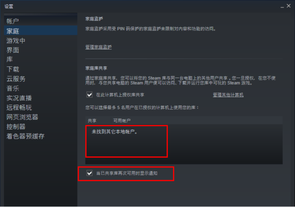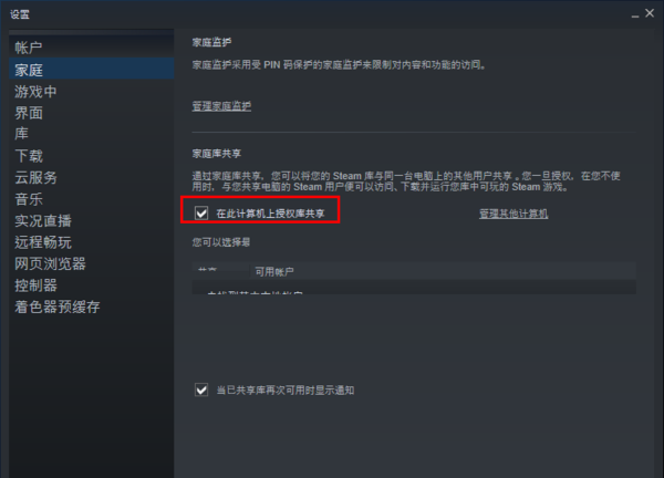 四、当我们勾选上以后,下方就会出现可以共享的账户供我们选择,如下方红色方框圈住的位置所示。因为小编没有在steam上注册游戏账号,所以这里没有显示,不过如果你按照上述方法进行操作,就可以显示你的游戏账号了,选择好想要共享给好友的账号,还需要将“当已共享库再次可用时显示通知”勾选上,这样当你在进行游戏的时候,如果对方就不能成功登录你的账号,可以防止你被好友顶下去,这个功能非常的贴心。