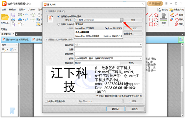 7、点击【文档】-【数字前】-【签名文档】,选择【使用系统中保存的证书】,点击后面的下拉键,可以看到我们创建的所有数字签名。