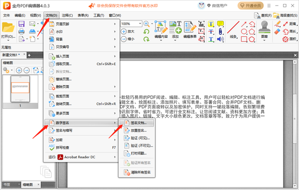 2、在软件界面上方的菜单栏处,点击【文档】-【数字前】-【签名文档】。