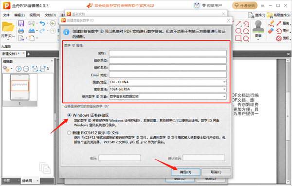 4、打开签名文档的操作页面后,在弹窗上对应的方框中输入数字ID属性的信息,根据我们自身的需要选择自签名数字ID储存的位置再点击【确定】。