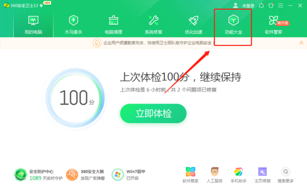 第一步,运行360安全卫士后点击上方的【功能大全】;
