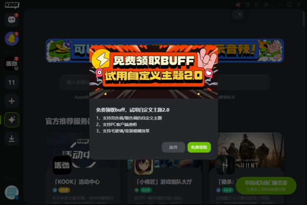 1、登陆KOOK,确保更新到了最新版本,之后我们会受到官方赠予我们免费的外观主题体验的资格,我们点击【免费领取】;