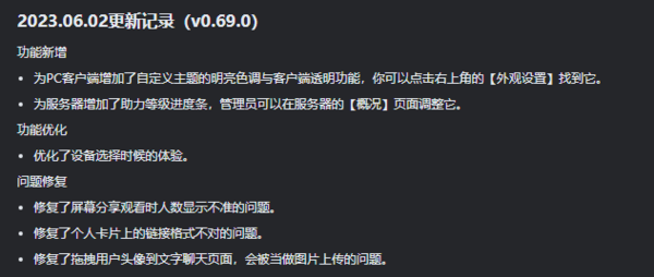 答案是【能】,现如今,KOOK开黑啦来到了V0.69.0版本,在官方给出的更新记录中可以看到pc客户端增加了自定义主题的明亮色调和客户端透明功能。