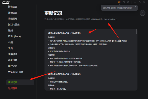 那是因为KOOK没有更新到最新版本,大家还是在设置界面,下拉左侧列表找到【更新记录】,查看一下当前版本,然后更新到最新版本即可。