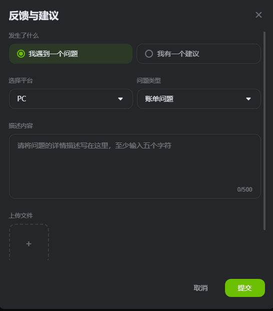 3、我们还可以点击【提交工单】的按钮,之后会弹出【反馈与建议】的窗口,在这里将问题反馈给官方,等待处理即可。