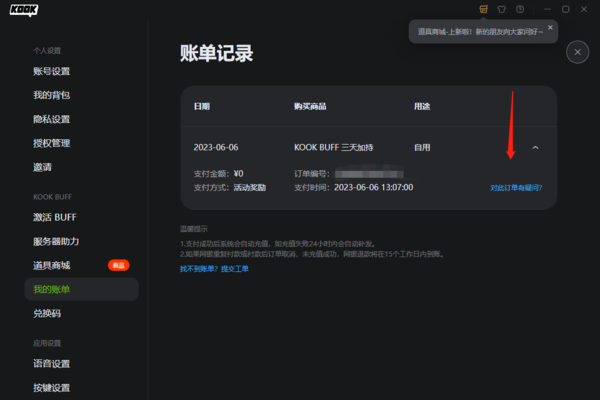 KOOK开黑啦是一个功能特别强大的游戏语言工具,内置的频道功能独具特色,相信很多小伙伴们们都创建了自己的频道,在频道中我们若想开启一些特色功能和权限就要充值购买,有的小伙伴表示自己充值之后不知道在哪里查看购买记录,今天小编就来教大家如何查看购买的订单记录。