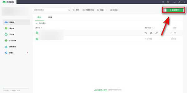 二、通过下图可以看到,在希沃白板5的主界面右上角的区域有一个绿色背景按钮的“新建课件”,此时只需点击即可。