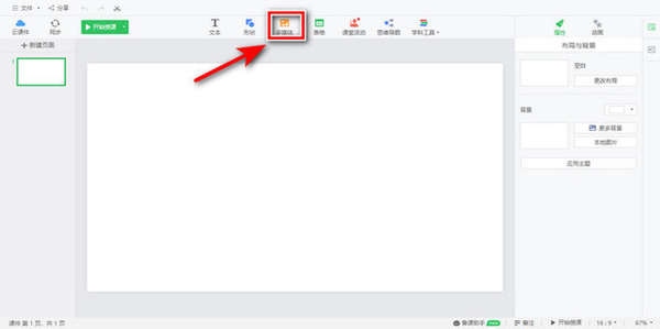 四、进入到课件的编辑区以后,点击上方功能栏的“多媒体”选项。
