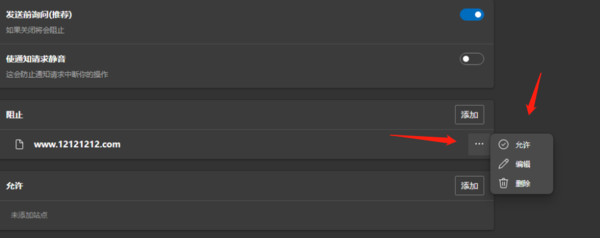 在【阻止】一栏中找到要恢复权限的网站,点击后方的【。。。】按钮,找到【删除】或者【允许】并点击即可。