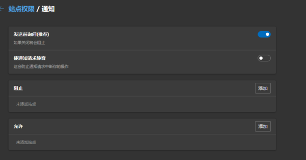 3、假如我们想要禁用某个网站调用我们【发送通知】的权限,可以在这里找到【通知】一栏并点击进入,进入后可以看到在这里可以设置【发送前询问】、【阻止】和【允许】;