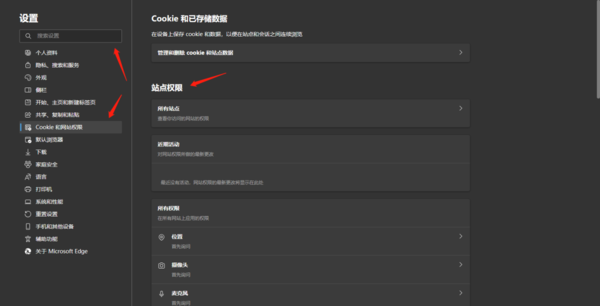 2、在设置界面,点击左侧【Cookle和网站权限】,不想找的同学们可以在搜索框中直接诶搜搜【站点权限】,在右侧找到【站点权限】分区;