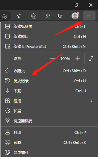 1、大家可以点击浏览器右上角的【。。。】按钮,在下拉的列表选项中找到【历史记录】,或者按下快捷键【CTRL+H】将其打开;