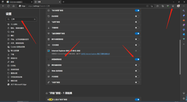 如果大家需要经常用到截屏功能,那么大家可以将此功能放到主界面中,方便我们点击,首先我们进入设置中心,在左侧搜索栏中搜索【工具】或者【截图】等,定位到具体设置处,之后将右侧的按钮打开,即可看到对应的功能出现在了右上角处,我们再打开时直接点击就行了。