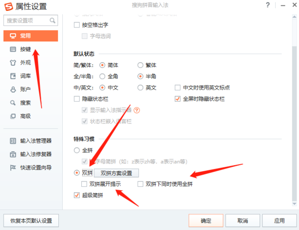 2、进入属性设置之后,在左侧选择【常用】分栏,并在右侧找到【特殊习惯】中的【双拼】,然后勾选;
