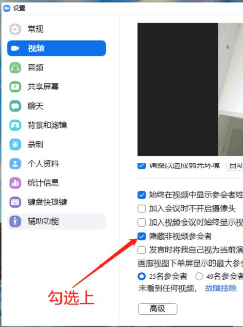 6、从下图可以看到,进入到视频设置页面后,在页面中找到“隐藏非视频参会者”这一选项,将前面的方框勾选上就可以了。