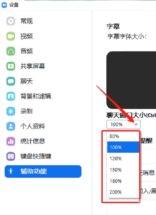 4、在辅助功能页面,可以看到有“字幕字体大小的调节”以及“聊天窗口的大小调节”,我们点击聊天窗口下面的下拉框,可以将尺寸比例设置为80%?、100%?、100%、120%、150%、180%、200%,根据自己对Zoom软件原主界面尺寸进行相应的调整即可。