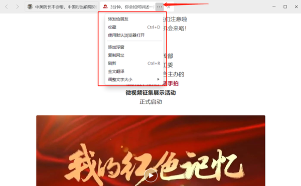 3、同时小编发现这次更新还有一个新功能,微信电脑版在使用内置默认的浏览器打开网页时候,已经支持同时打开多标签了,原来在顶部的工具栏,现在被放到了标签页右侧的三个黑点处,用鼠标点击就能够使用转发给朋友、复制网址、添加浮窗、全文翻译、收藏和调整文字大小等功能,非常的方便,还有一个小变化就是当PC端微信点击链接以后,电脑底部的状态栏里面增加了微信内置浏览器的新图标。