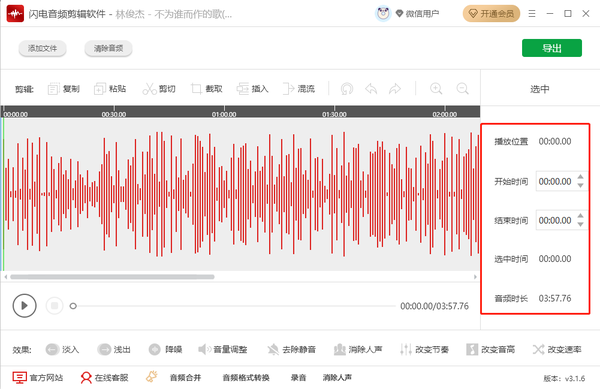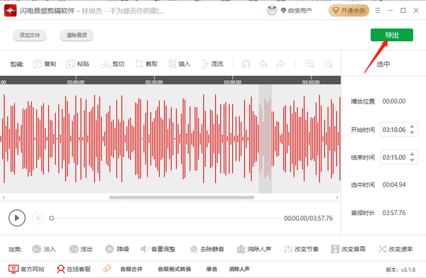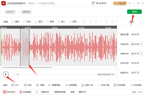 4、选中音频内容后,我们可根据自己的需要对音频进行编辑。最后,点击【导出】即可。