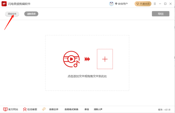 1、打开闪电音频剪辑软件,点击【添加文件】将需要处理的文件导入进来,或者直接将文件拖拽进来。