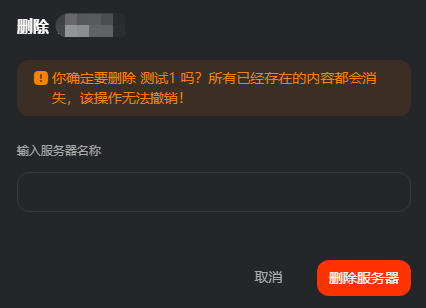 3、点击删除服务器后,会出现提示窗口,这里需要我们输入想要删除的服务器的名称,输入后删除即可,删除服务器后在主页中的消息就无法在此查看了,里面的数据也是一起删除的,无法恢复,所以大家要慎重选择。