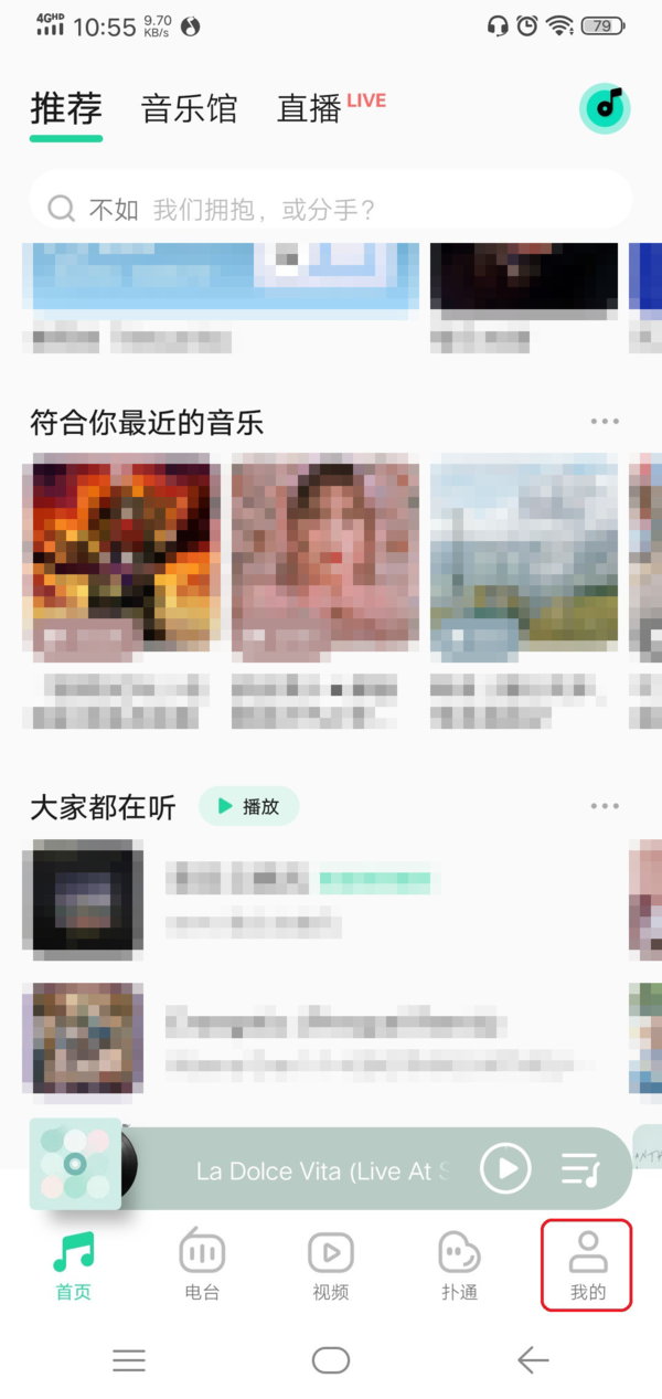 第一步,找到QQ音乐软件,然后点击打开,进入到软件的主界面当中后,我们找到界面右下角的【我的】选项,并点击进入。