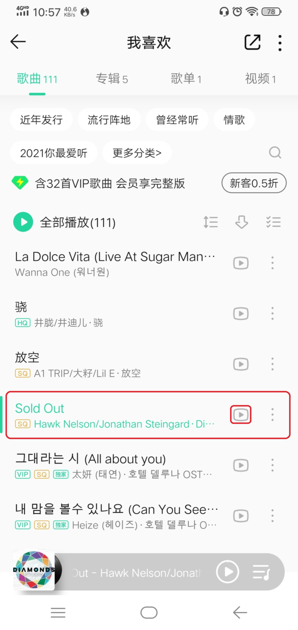 第二步,进入到我的界面中,然后找到想要保存MV的歌曲,并在歌曲的最右侧,有一个视频播放的按钮,点击它。