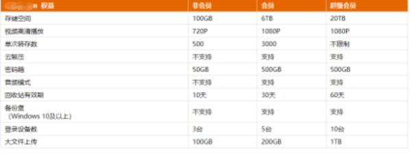 三、从表中可以看到,如果你不是会员和超级会员用户,那么只能享受100GB的储存空间,视频高清播放的格式是720P,单次转存数是500次,不支持云解压技术、音频模式、备份盘功能,密码箱的储存空间是50GB,回收站的有效保护期是10天。对于普通用户的这些权益,你觉得够你使用了吗。