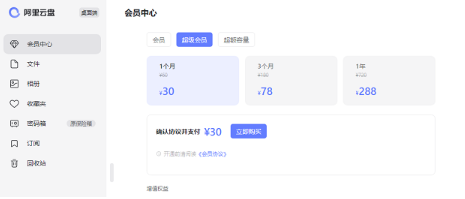 2、而阿里云盘超级会员的价格是每个月30块钱,直接开通三个月的话是78块钱,年费超级会员是288块钱。