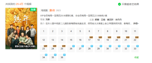以爱奇艺电视剧更新的通用套路来看,正在热播的电视剧通常是不需要会员的,电视剧《熟年》也是如此,只不过充值会员可以提前看到新的剧情,如图所示,VIP会员每周一至周四的20:06更新2集,而非会员每周一至周五22:00转免1集。