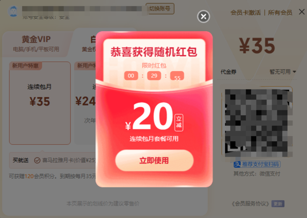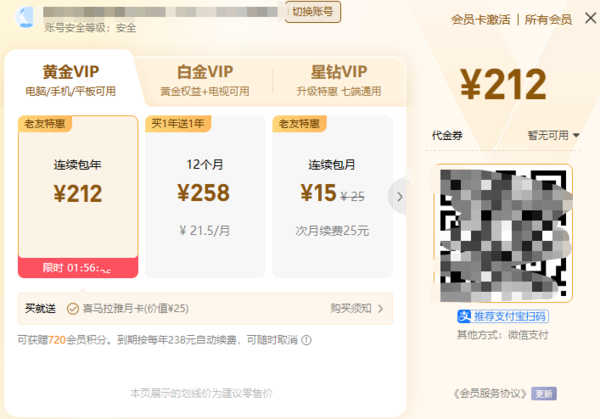 爱奇艺会员有黄金vip、白金vip和星钻vip三种类型,对应的权益也越来越多,如果大家只想追这一个月的剧,大家可以充值连续包月,首月仅需15元,生效后取消订阅即可。
