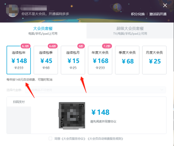 可以看到,目前哔哩哔哩大会员正在打折,连续包年仅需148,连续包月也只需要15,开通后,电脑、手机、Mac端都可以使用,还是非常划算的。