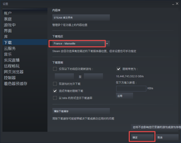 第六步,而如果下载的是国外游戏,此时我们可以根据地区的不同,来选择不同的国家,然后点击界面下方的【确定】按钮。这样一来,就可以正常的进行游戏的下载了。