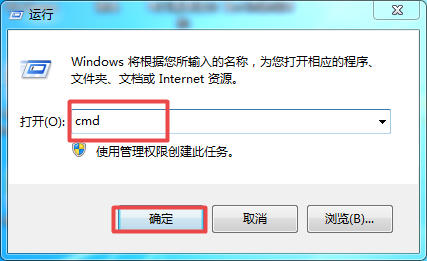 第二步,接着系统会弹出【运行】的窗口,此时在搜索栏当中输入【cmd】命令,然后点击【确定】按钮。
