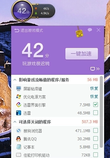 360会检测当前电脑后台中占用网络资源的程序,并为大家列举出来,通过给出分数的形式,表达当前电脑玩游戏的性能表现,大家可以通过游戏模式,找到当前没啥用的程序,勾选后一键清除,可释放电脑运存,保障更好的游戏体验。