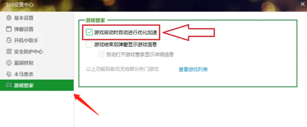 2、随后,在设置中心左侧。找到【游戏管家】,在这里取消勾选【游戏启动时自动进行优化加速】即可,最后点击【确定】保存。