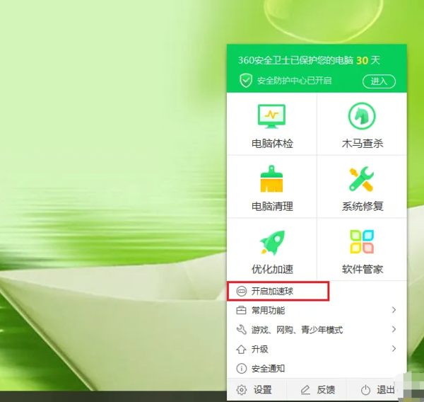 1、首先启动360安全卫士后,右下角右键单击360的图标,点击【开启加速球】;