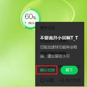 3、切换旧版加速球后小贝模式就会关闭,点击【确认切换】;