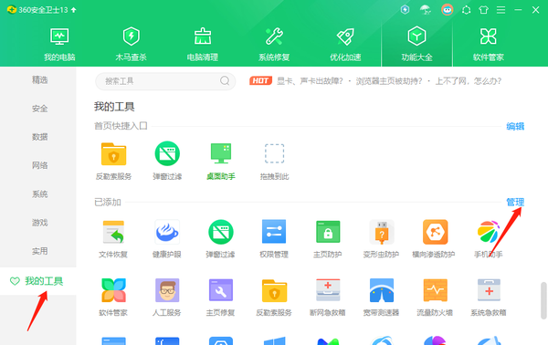 1、在【功能大全】页面中,来到【我的工具】,然后点击【已添加】后面的【管理】,这时下面的软件工具都会在右上方显示一个红底的叉形按钮。
