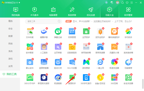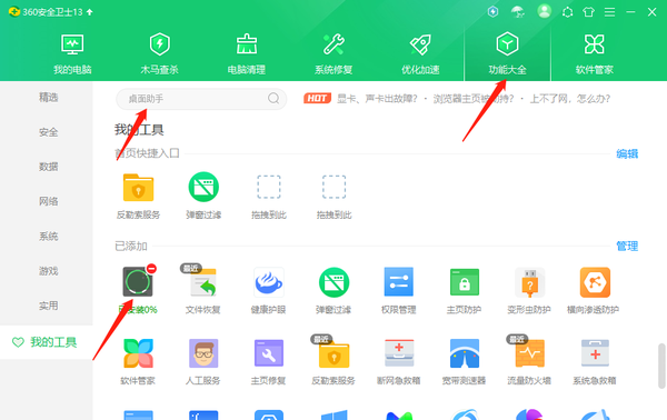 1、打开360安全卫士,点击上方菜单栏【功能大全】,在搜索框中搜索【桌面助手】。然后会进行安装。