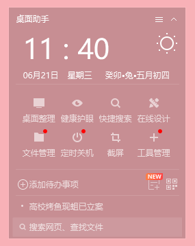 360安全卫士桌面助手除了常规的可以看到天气、时间外,还可以一键解决桌面混乱问题,自动整理,分类归纳,让桌面文件更有序;还有独创的文件查找功能,秒搜全盘文件,快捷查看调用,再也不用担心文件遗忘找不到。除此之外,还有备忘录功能,打开电脑就能看到未完成的事。
